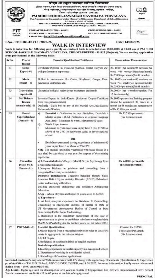 PM SHRI School Jawahar Navodaya Vidyalaya, છોટાઉદેપુરની આ ભરતી શિક્ષણ અને તાલીમ ક્ષેત્રમાં કારકિર્દી બનાવવા ઈચ્છુક ઉમેદવારો માટે એક સારો અવસર છે. અહીં સારી ફિક્સ સેલેરી સાથે સરકારી શૈક્ષણિક સંસ્થામાં કામ કરવાની તક મળશે. ઉમેદવારોને સલાહ આપવામાં આવે છે કે તેઓ જરૂરી દસ્તાવેજો સાથે 18 ઑગસ્ટ 2025ના રોજ સમયસર ઇન્ટરવ્યુમાં હાજરી આપે.